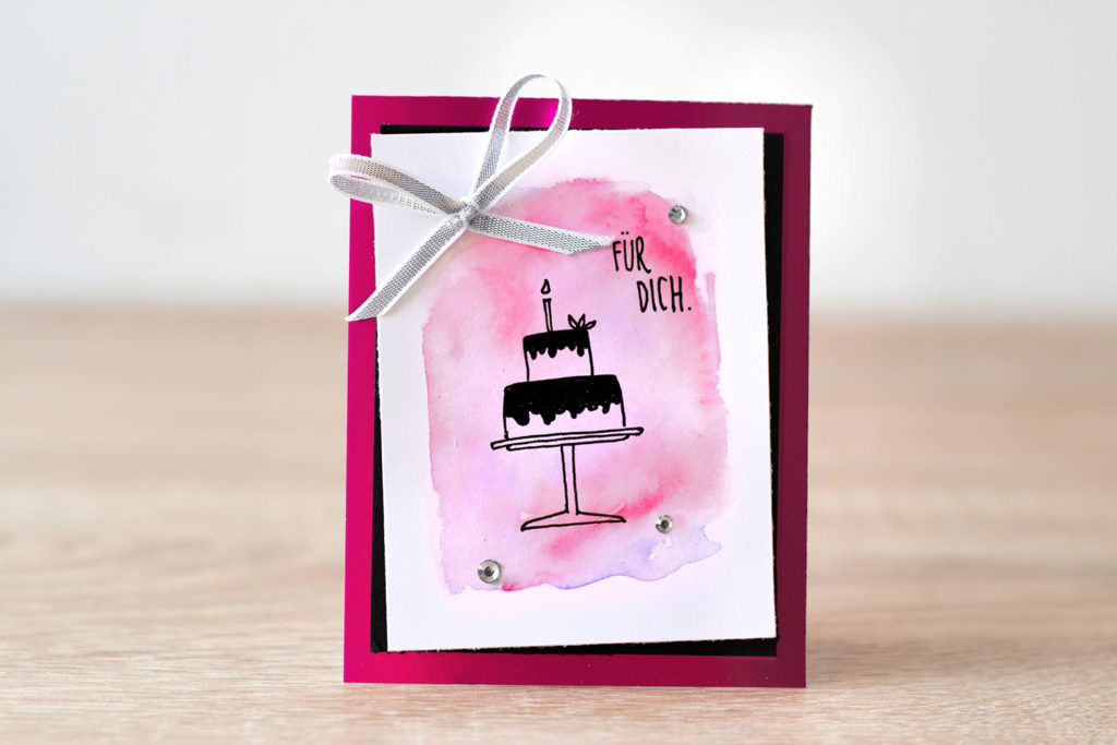 Geburtstagstorte, Tauftorte, Hochzeitstorte – die Torte bildet den Mittelpunkt vieler Festlichkeiten. Und hier auch den Mittelpunkt unserer Karte. Passend zum schwarzen Hintergrund habe ich die Schokoglasur schwarz ausgemalt, um so für einen kräftigeren Kontrast zu Sorgen.